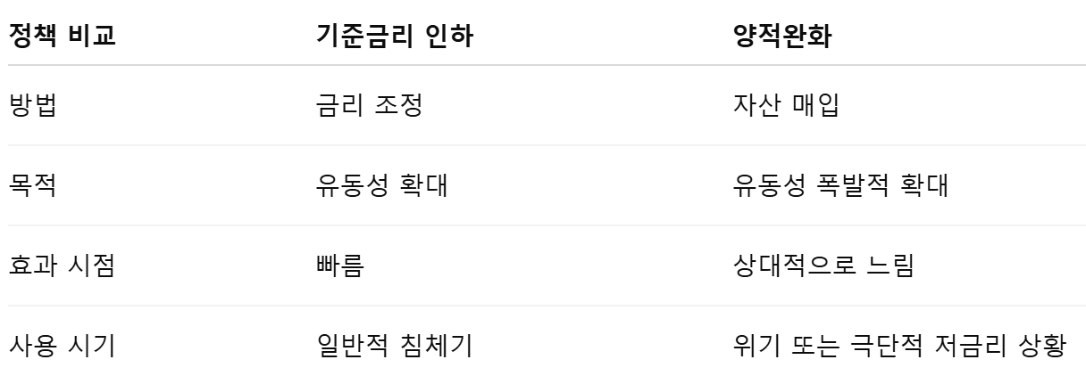 그런데 어느 시점이 되면 기준금리를 더 이상 낮출 수가 없습니다. 제로금리(0%) 혹은 그 이하가 되면, 금리를 내리는 것만으로는 한계가 생겨요. 이럴 때 등장하는 게 바로 양적완화입니다.