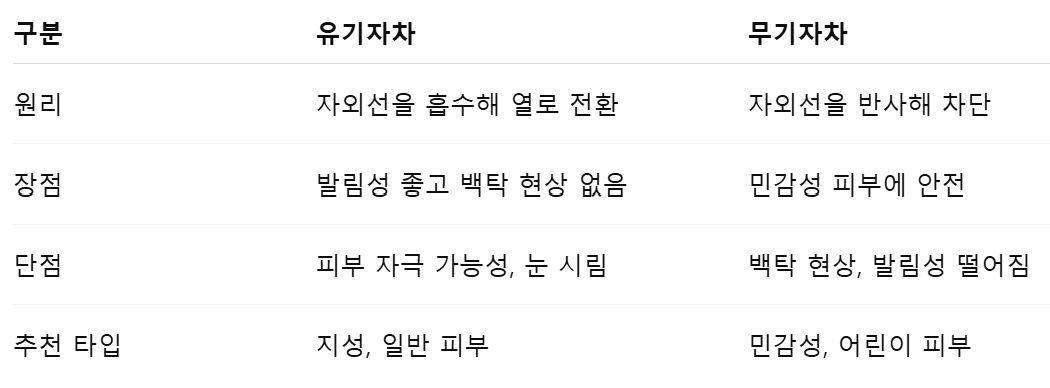 👩⚕️ 전문가 TIP: 민감하거나 여드름성 피부에는 무기자차, 일반 피부는 유기자차도 무방